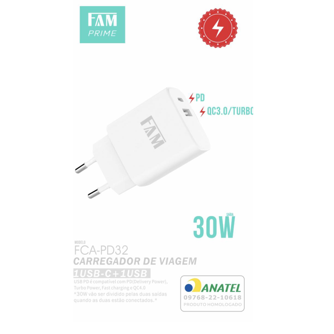 TOMADA 2USB - 1TIPO C 30W FCA-PD32 ANATEL