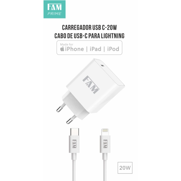 KIT CARREGADOR COM CABO LIGHTNING/TIPO C 1 USB 20W FKT-M203 ANATEL