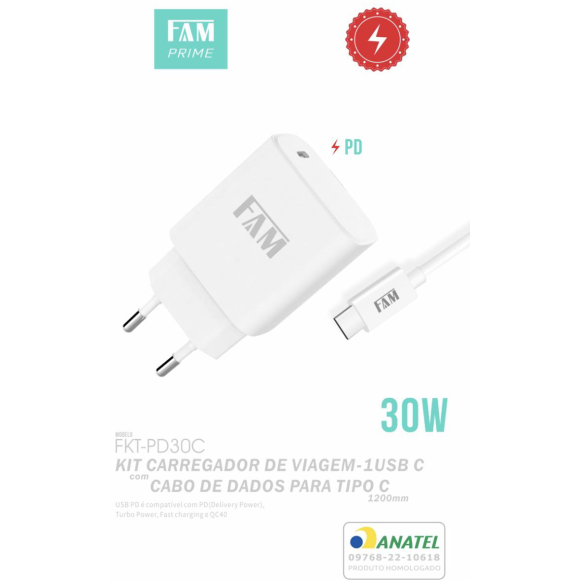 KIT CARREGADOR COM CABO TPC/TPC 1 USB 30W FKT-PD30C ANATEL