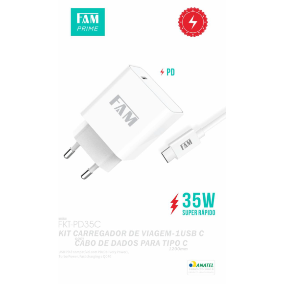 KIT CARREGADOR + CABO TIPO C/TIPO C 1 USB 35W FKT-PD35C FAM
